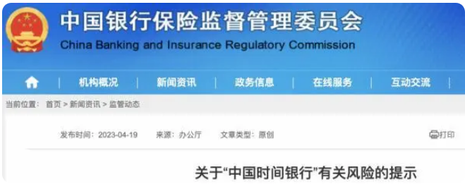 银保监会表示,从未批准设立“中国时间银行”,相关网站、社交平台、APP等所称“中国时间银行”有关内容均为虚假消息,相关投资活动涉嫌违法犯罪,请公众谨慎辨别,谨防上当受骗。